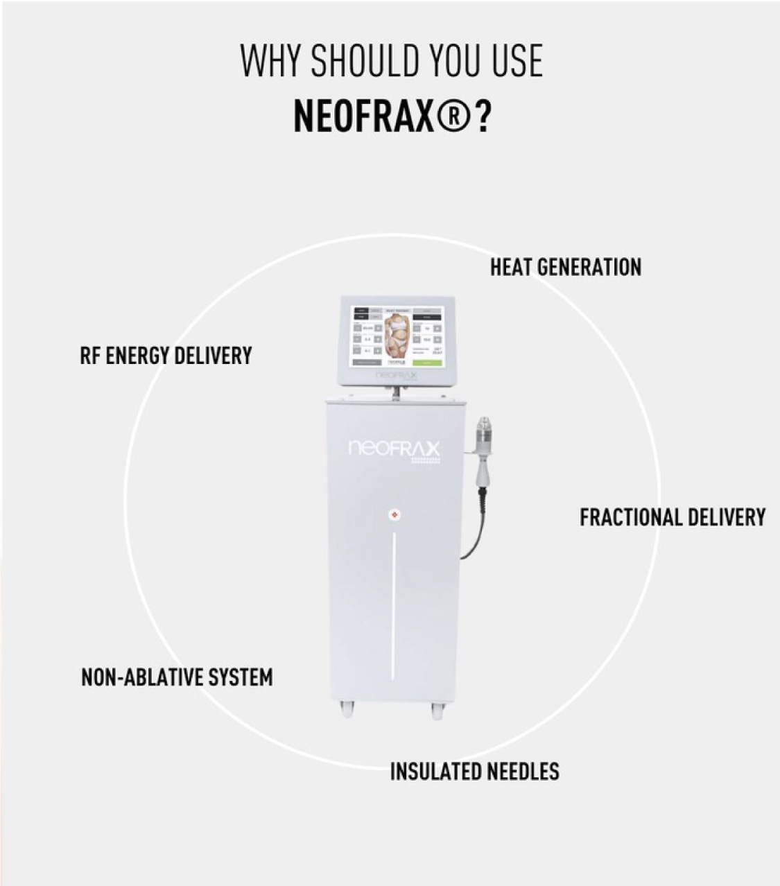 The combination of coagulation and controlled heating stimulates collagen production. The body's natural wound healing response, triggered by the micro-injuries from the needle, leads to collagen remodeling. Over time, this process improves skin tone, texture, and NEOFRAX®, a revolutionary beauty technology utilizing RF needling, offers a diverse range of advanced skin therapies to address various beauty concerns.